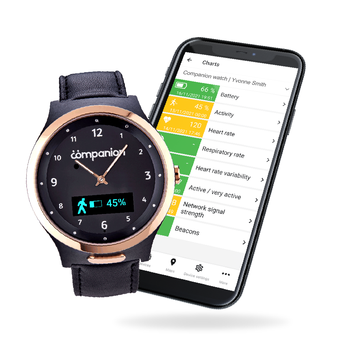 Whenever the Companion Watch is being worn, it is collecting wellness information about the wearer including activity, heart rate and respiratory rate. This is then displayed simply through the Companion App, allowing the wearer and support network to review it using their mobile, tablet or desktop devices.